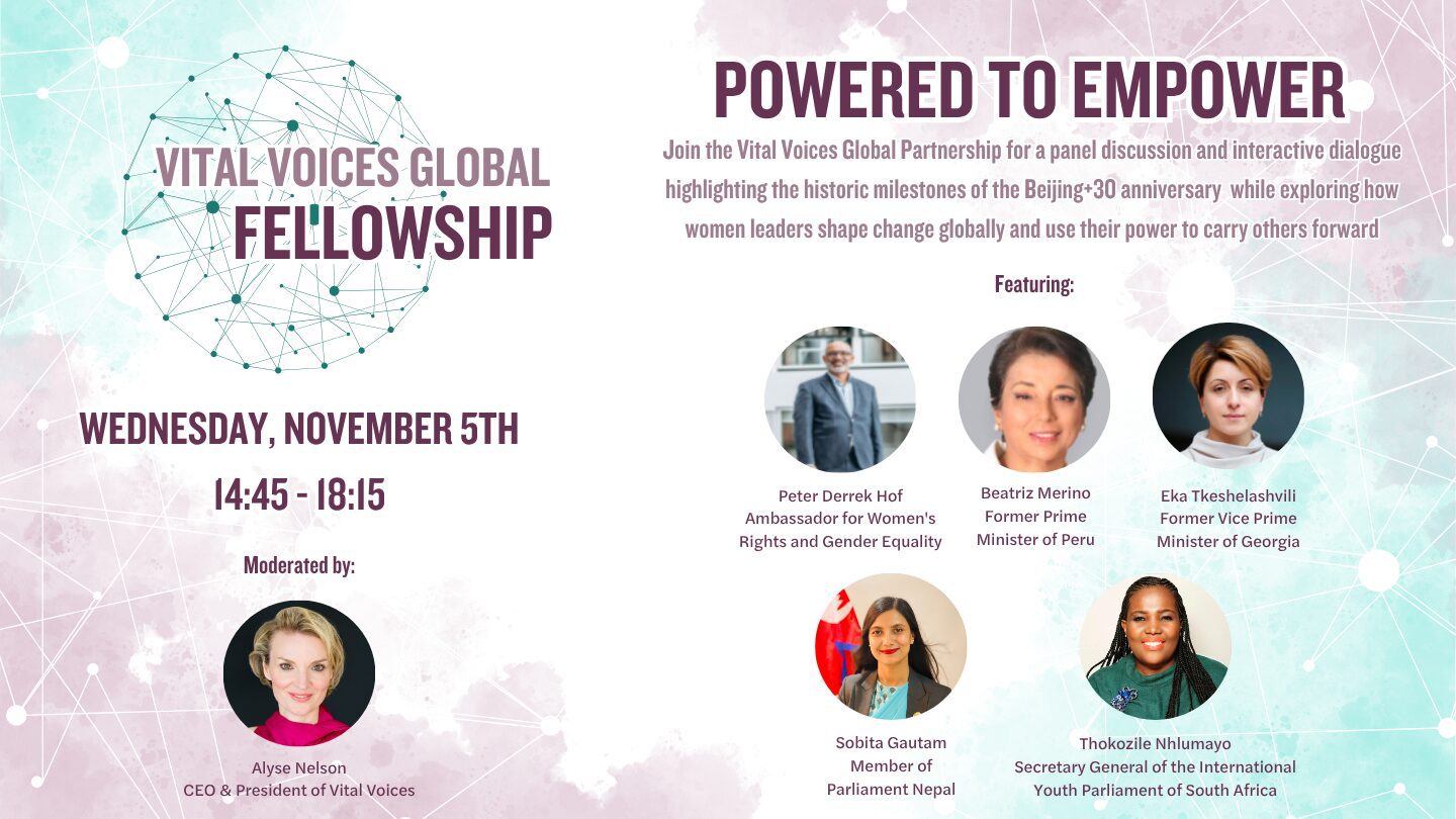 This event is being held as part of the 2025 Vital Voices Global Fellowship (VVGF) In-Person Convening in The Hague and will feature a panel discussion and interactive dialogue, bringing together current Vital Voices Engage fellows, representatives from the Council of Women World Leaders (CWWL), public leaders, and other Vital Voices network members. The session will highlight the historic milestones of the Beijing+30 anniversary while exploring how women leaders shape change globally and use their power to carry others forward. Designed to encourage meaningful conversation, this event will celebrate progress, reflect on lessons learned, and chart pathways for the future of women’s leadership. Please see below for additional details:
