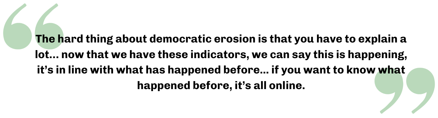 Thus, in a context where democratic recession is a relatively new trend, the indicators enable us to create a clear collection of instances of democratic suppression, in order to credibly explain to others that the trend is actually happening.