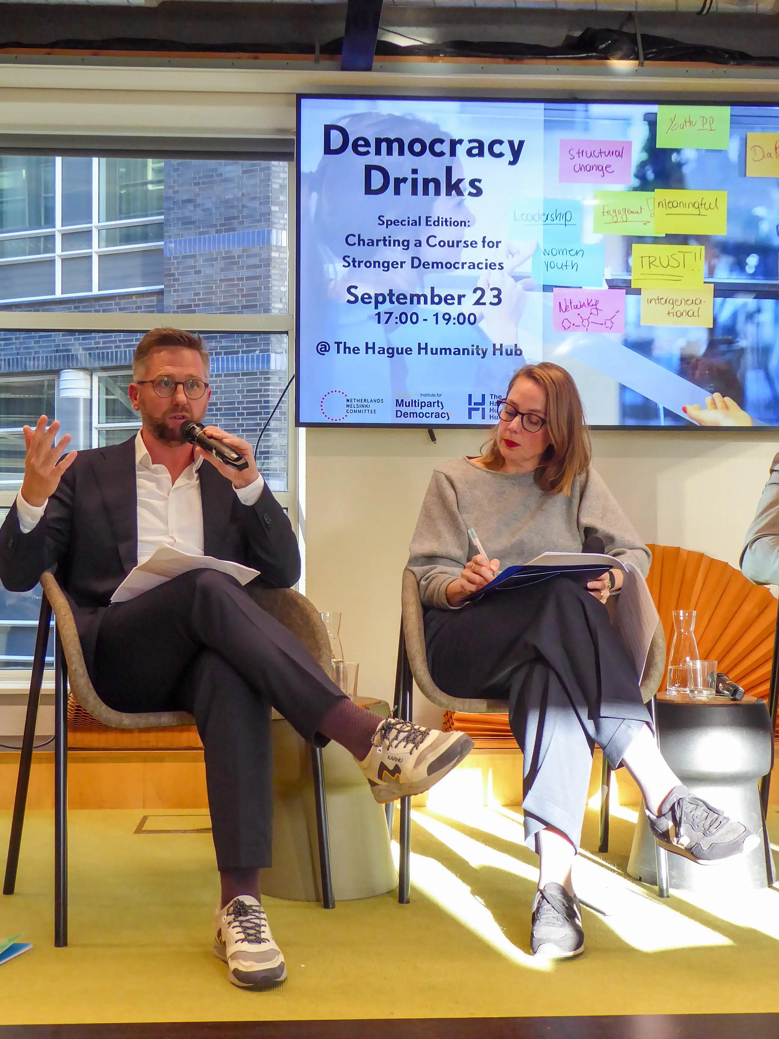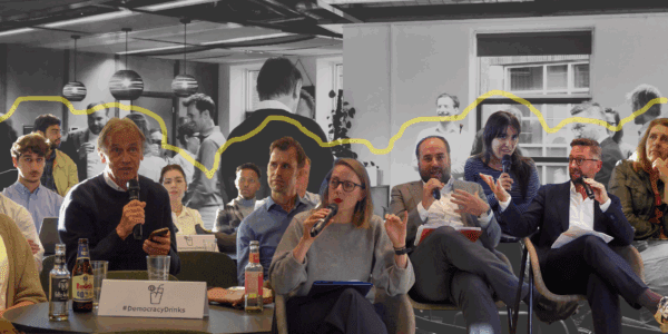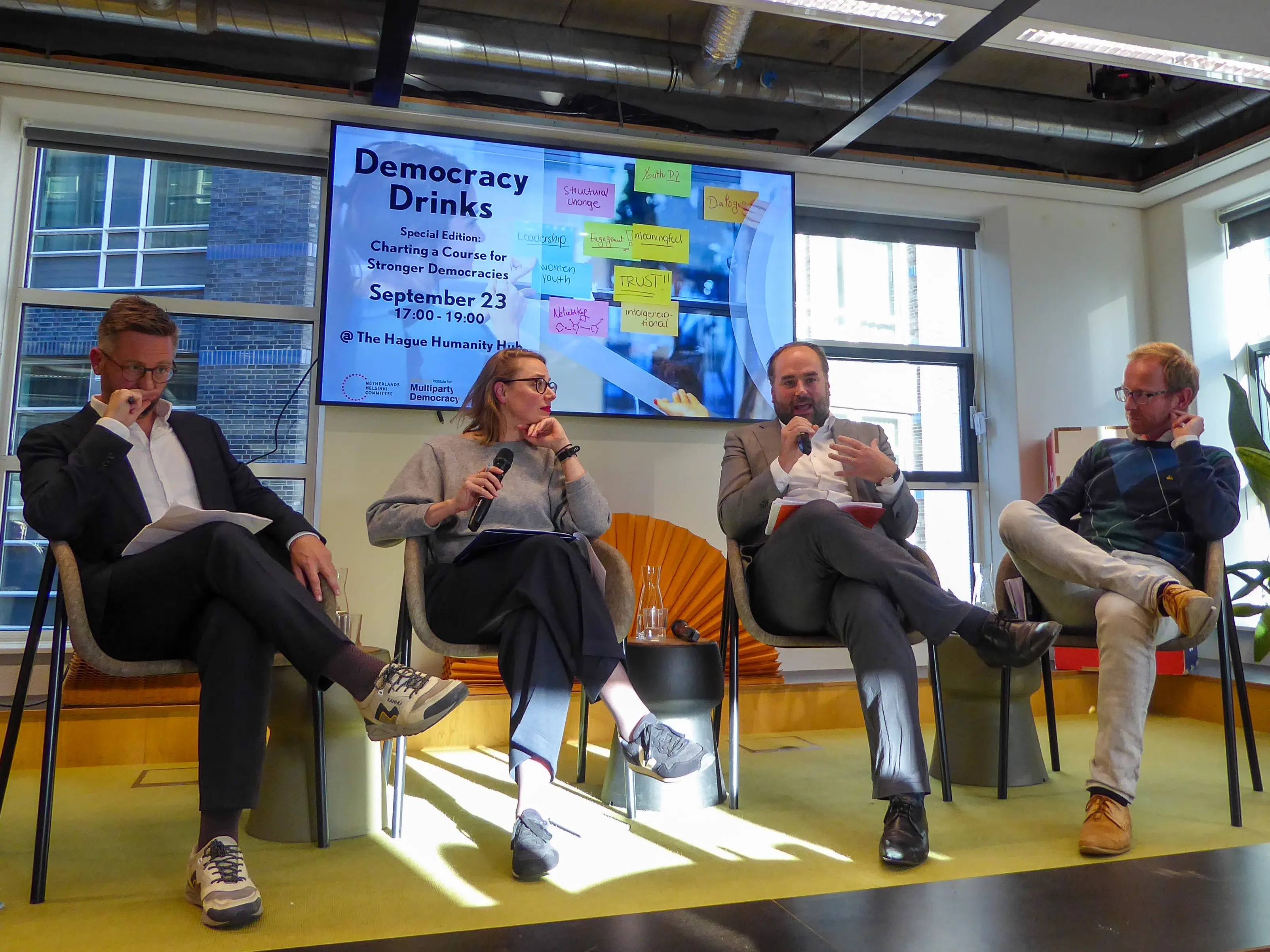 On September 23rd, democracy advocates, thinkers and enthusiasts gathered at The Hague Humanity Hub for #DemocracyDrinks The Hague – an ongoing collaboration between the Netherlands Institute for Multiparty Democracy (NIMD), the Netherlands Helsinki Committee (NHC) and The Hague Humanity Hub. In this edition, titled “Charting a Course for Stronger Democracies”, discussion centered on the systemic erosion of democracy across the world, the private sector’s stake in democracy protection, and ways to counter rising autocratic trends.