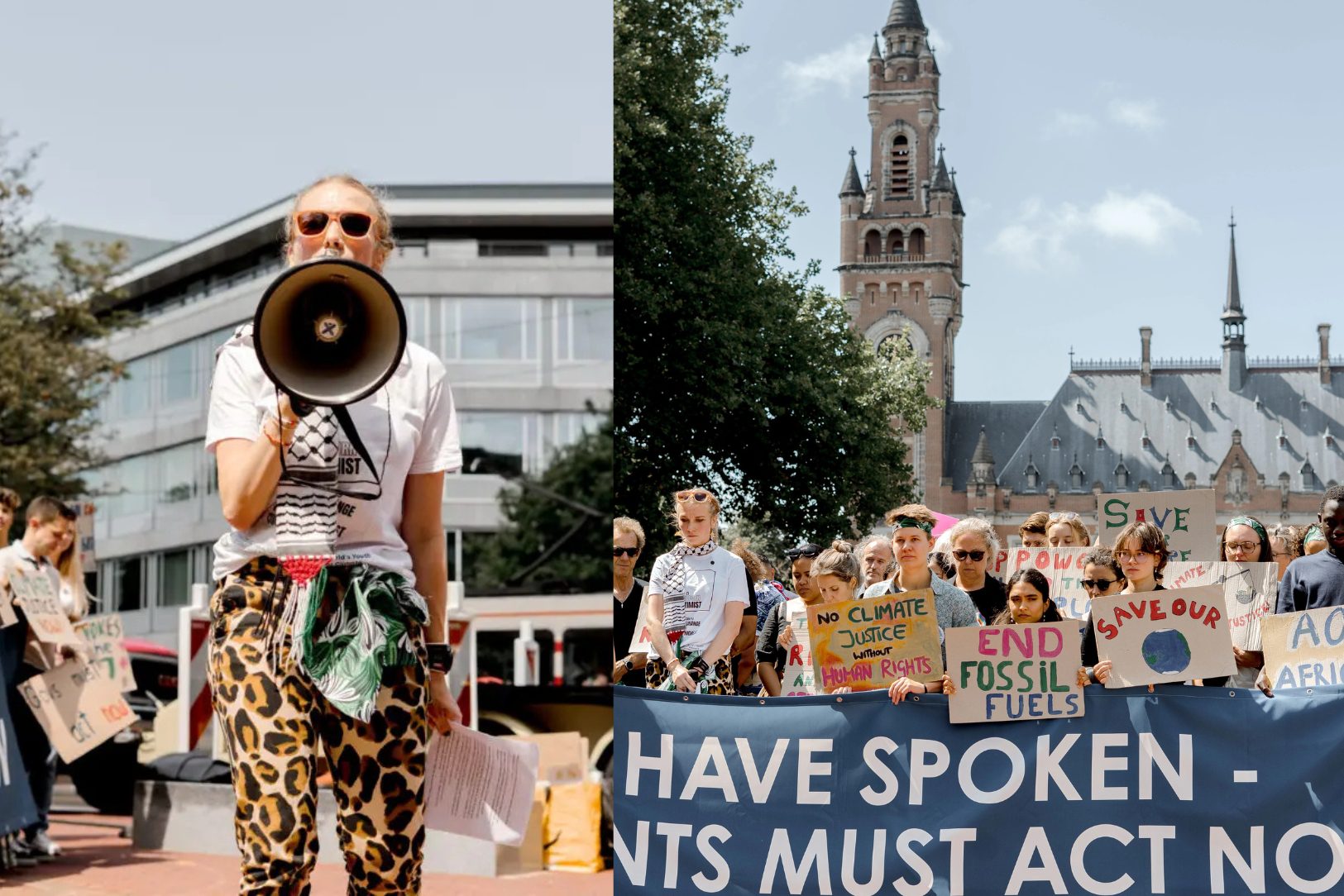 Jule Schnakenberg at the Peace Palace during the ICJ Advisory Opinion Solidarity Demonstration, 23 July 2025 | Copyright: Sacha Verheij/The Hague Humanity Hub