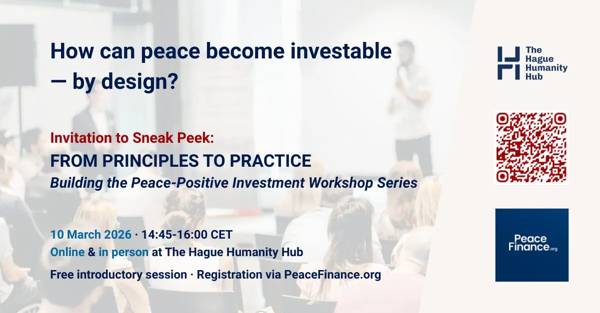 The Hague Humanity Hub Fluwelen Burgwal 58, Den Haag, ZH, NetherlandsAbout this session This two-hour workshop takes forward the Humanity Hub’s Investing in Peace initiative by introducing the principles and practice of Peace Finance – exploring how finance, innovation, and collaboration can actively strengthen peace and resilience. Peace Finance starts from a simple idea: every financial or organisational decision affects trust, inclusion, and stability. While some […]